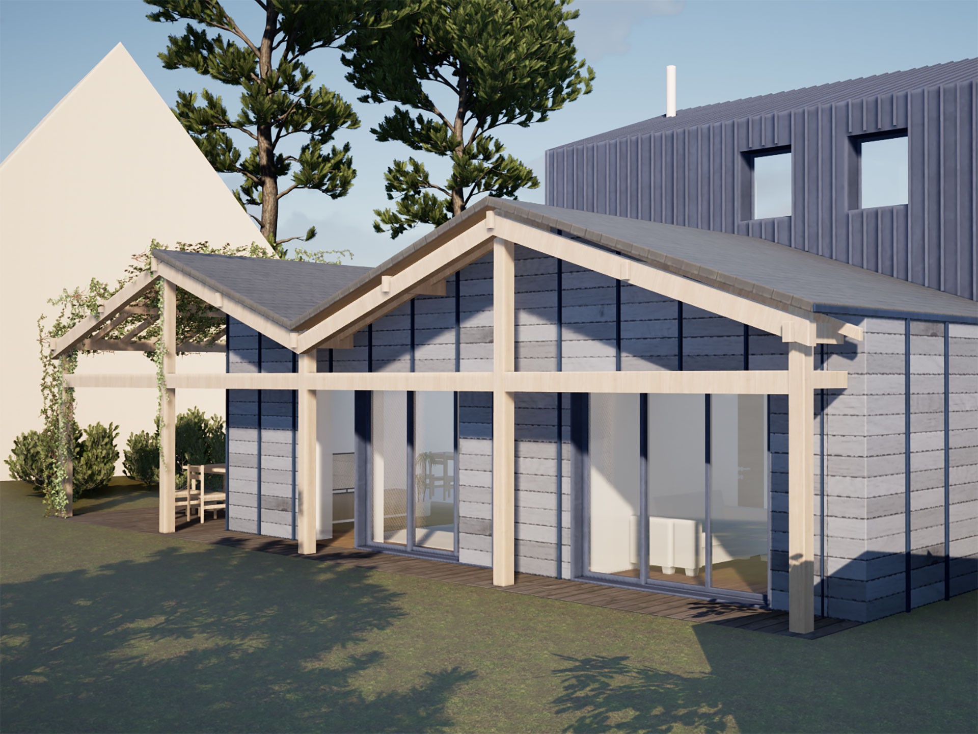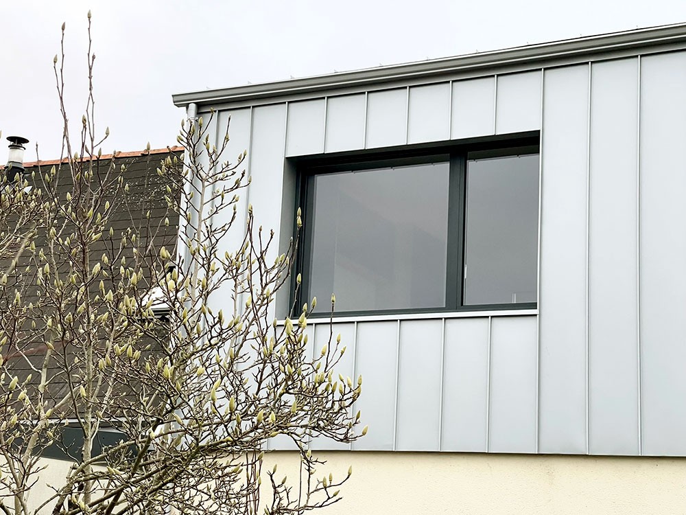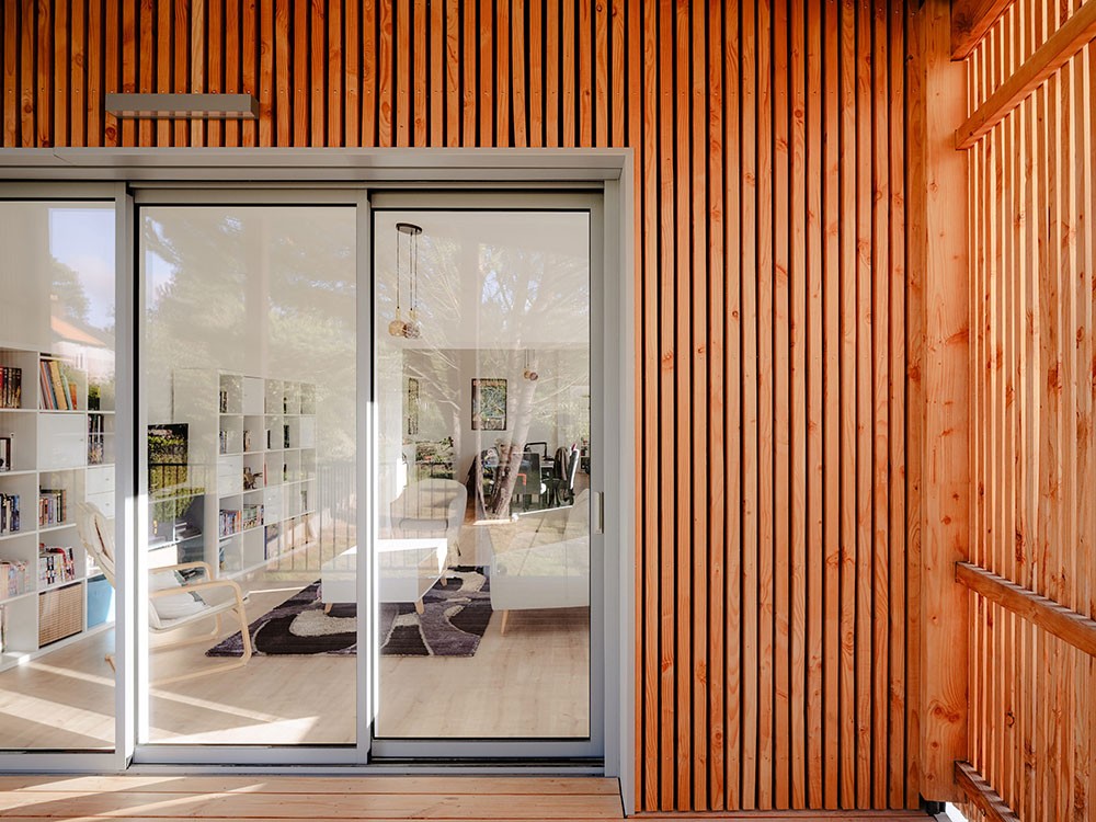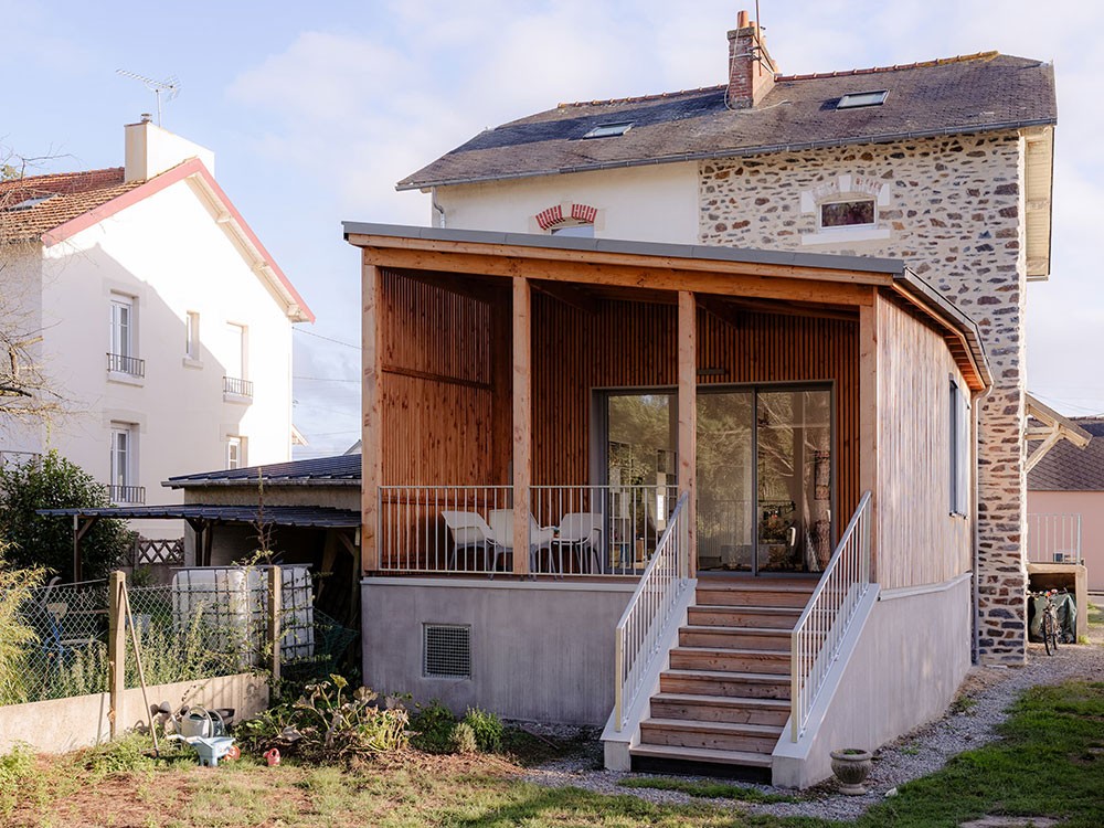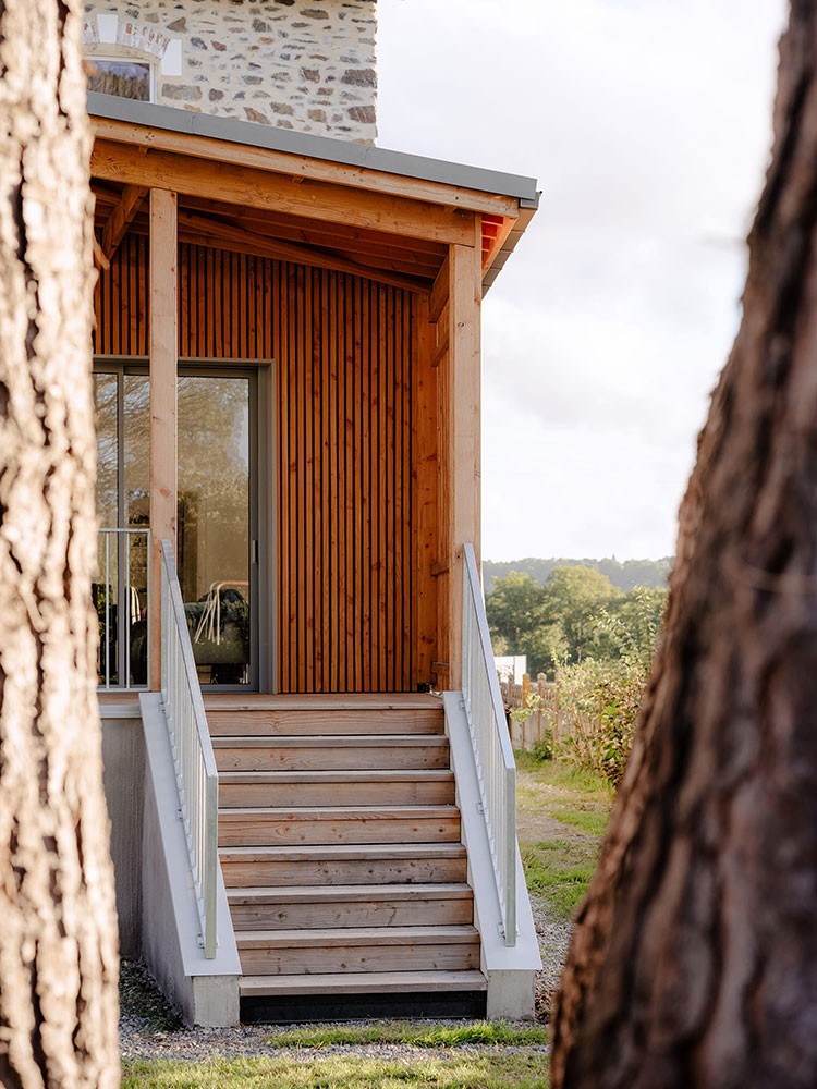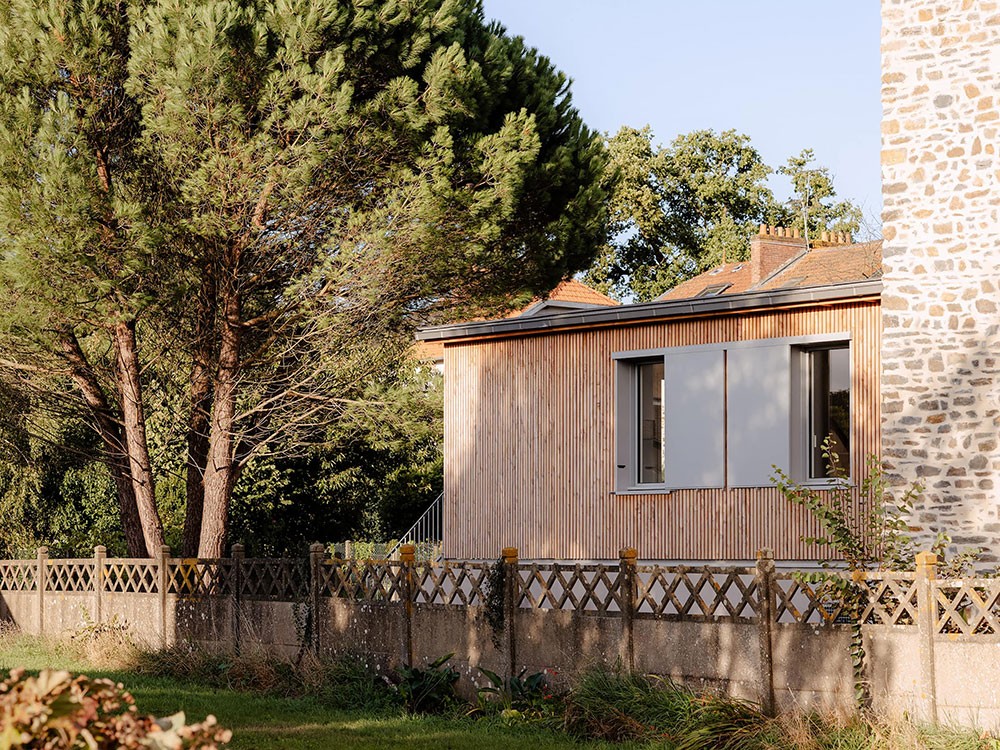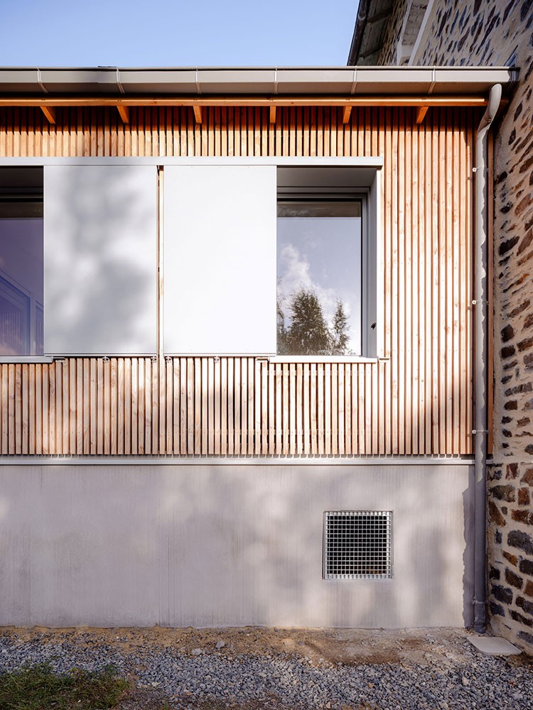 La rénovation thermique de l’enveloppe bâtie devient alors une occasion particulière pour repenser l’esthétique de cette maison des années 60, grâce à la création de nouvelles lucarnes et un dessin unique de bardage extérieur en châtaignier issu de productions locales et d'ardoises de réemploi.