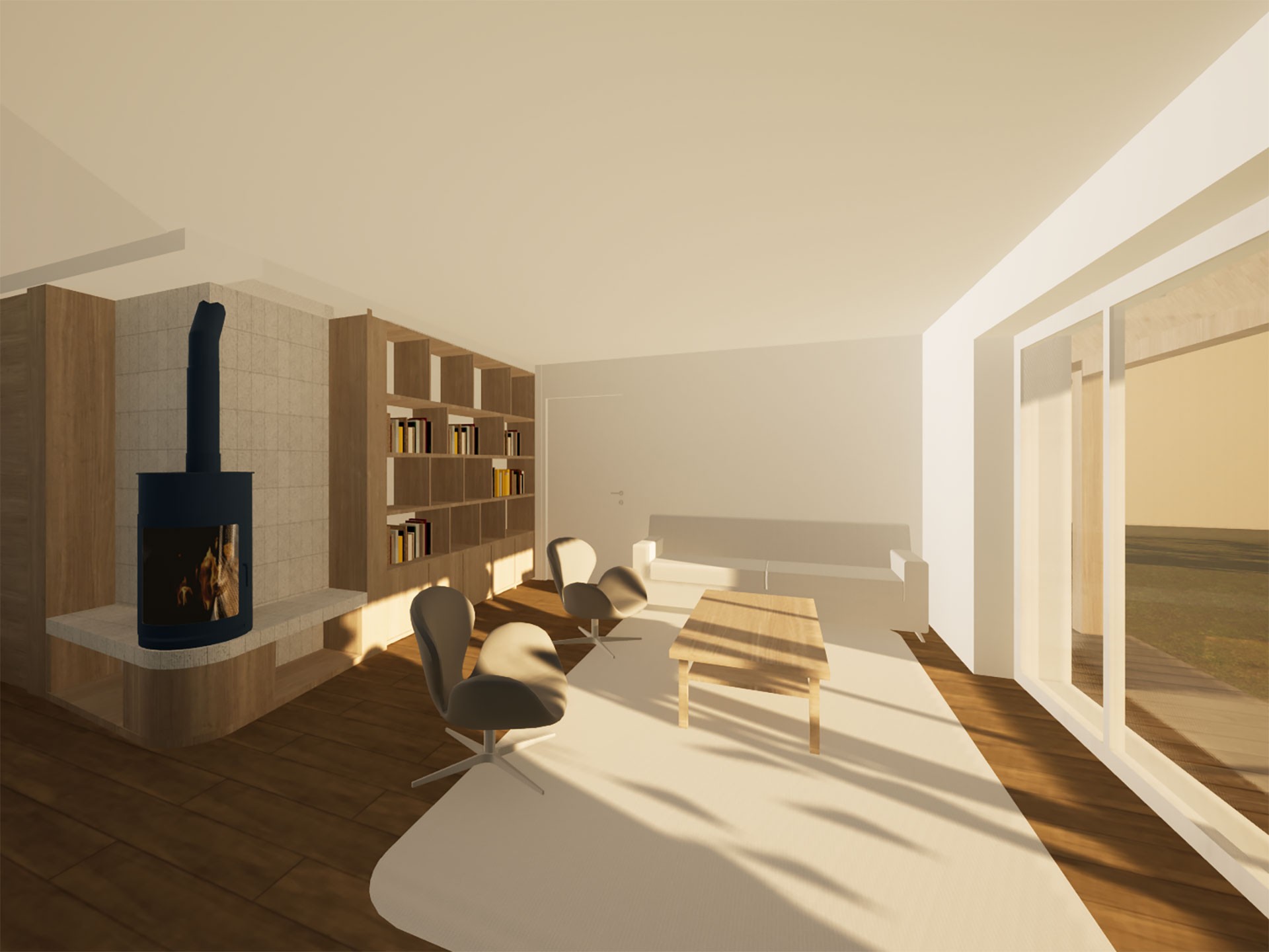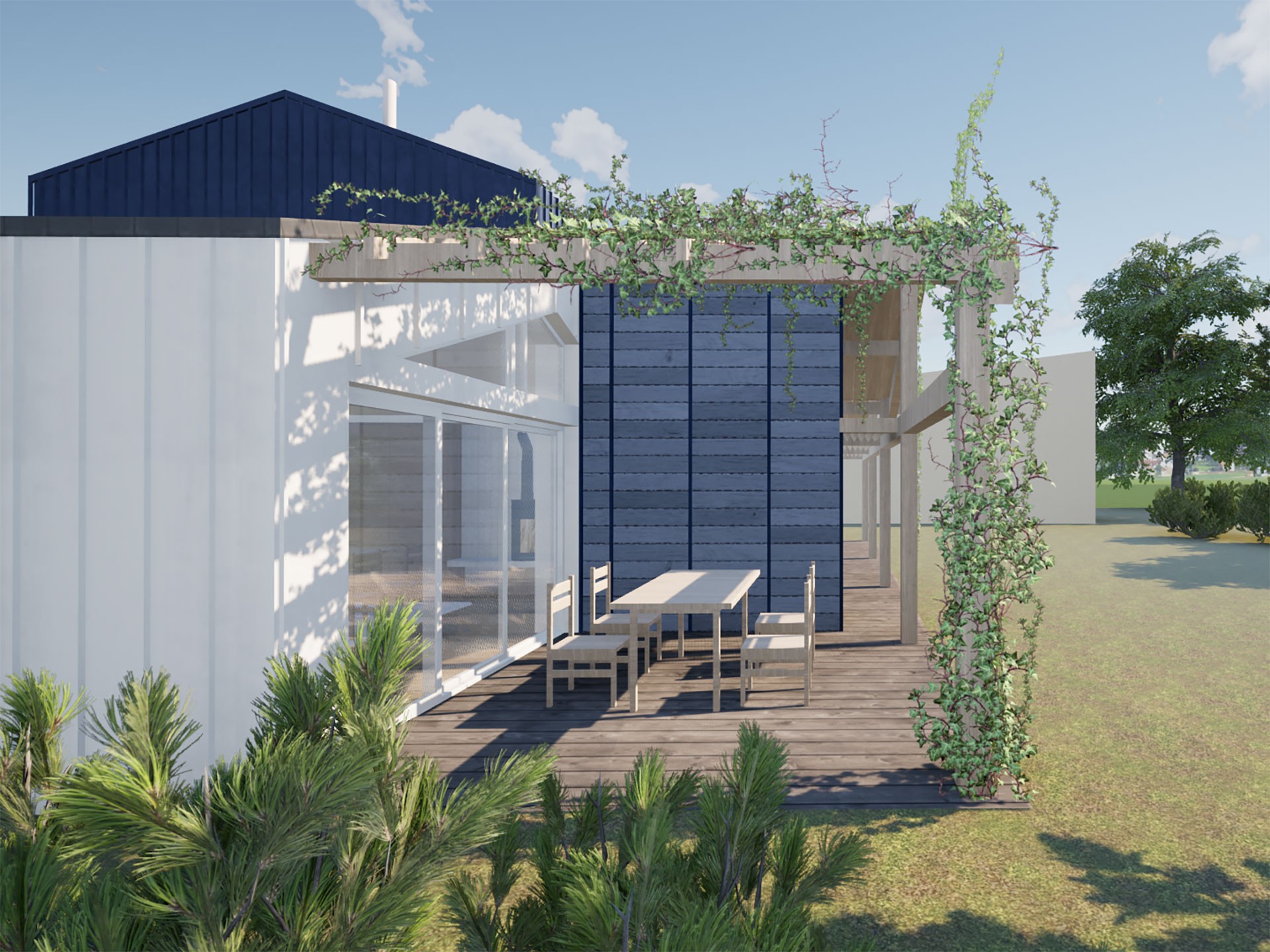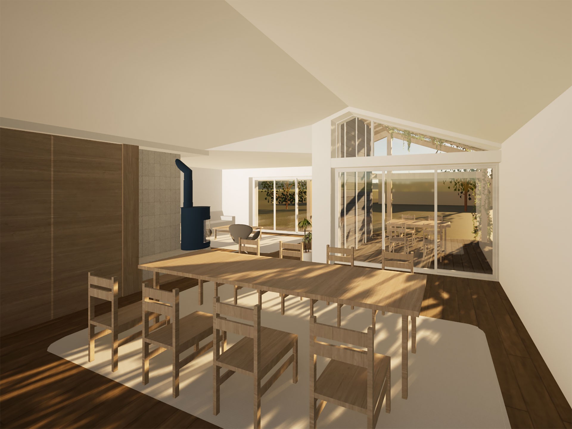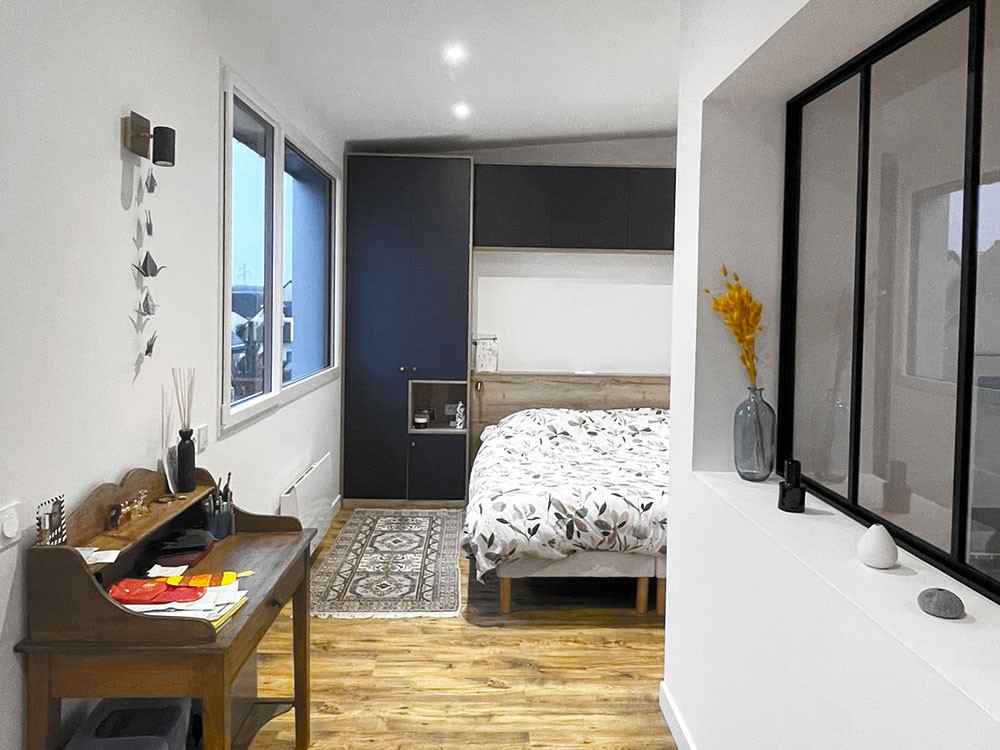 Concernant les espaces intérieurs, le projet a permis de faire évoluer la répartition interne des pièces et d’apporter de nouvelles qualités quant aux usages : en lien avec l’existant, l’extension constitue ainsi le nouveau séjour, espace de vie disposant d’un volume aux hauteurs libres généreuses, de vues traversantes et d’une exposition à l’ouest. En partie est, l’extension constitue une aile parentale intimisée. Cette dernière est composée d’un espace dressing accessible par le nouvel espace de vie, desservant la chambre et la salle de bain, et donnant accès au jardin existant au nord via un nouvel appentis.